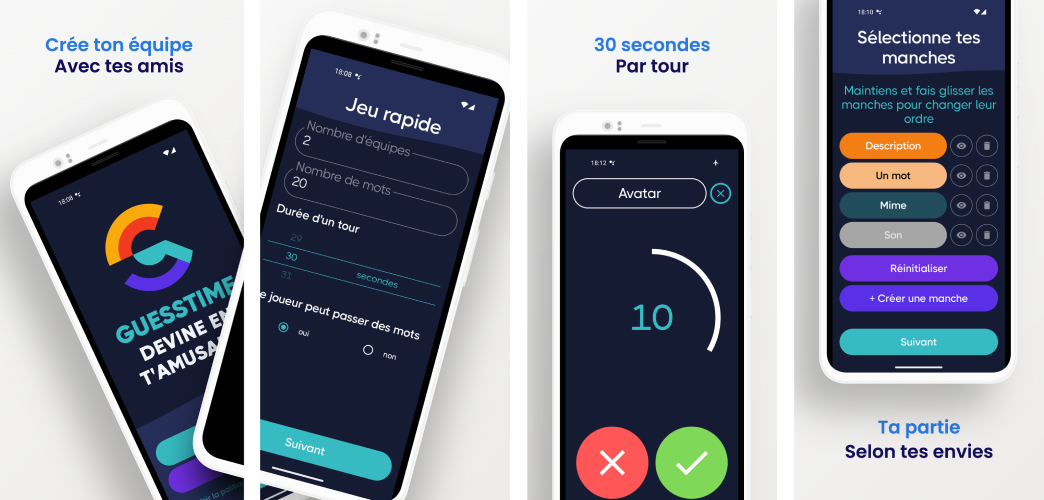 Découvrez GuessTime, le jeu parfait pour animer vos soirées en famille ou entre amis ! Plongez dans une expérience ludique où coopération et compétition se rencontrent. Le principe est simple : faites deviner un maximum de mots à votre équipe en une ou plusieurs manches. Mais ce n’est pas tout ! Avec GuessTime, chaque joueur peut personnaliser son expérience, créant ainsi un jeu unique qui reflète ses envies. Prêt à relever le défi et à partager des moments inoubliables ? Ne manquez pas l’occasion de transformer vos rassemblements en véritables fêtes de rires et de complicité !